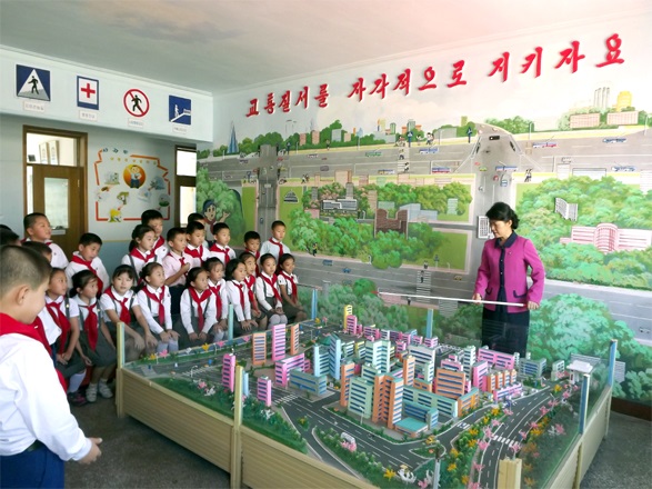 興味をそそる交通安全教育の場では、自分が住む町と村で守るべき交通秩序についての知識も広めています。新しい世代、未来を大事にする朝鮮労働党の政策を実行して、教育で成果をあげているここの教員たちの献身的な努力が、立派につくられた学校にそのまま秘められています。