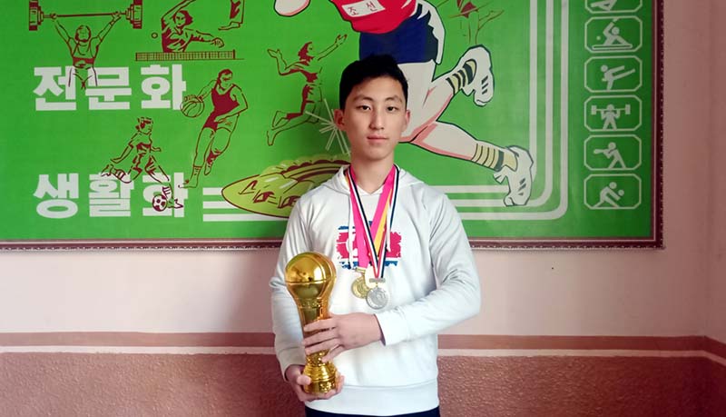 「今大会52キロ級でチョンリョン君は準決勝戦で相手の選手をトレードマークのアッパーカットで第1ラウンドでKOさせ、観戦者を驚かせました。決勝戦でも相手の選手の戦術を速やかに把握し、技術的な試合運びで優勝しました。今大会でチョンリョン君は金メダルと社会主義愛国青年同盟で優秀な生徒に授ける4月18日最優秀選手賞を授かりました」