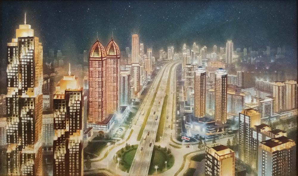 作品は眠れぬ住民の姿、ともし火明るいファソン通りの姿を朝鮮宝石画の優れた技法で表している。