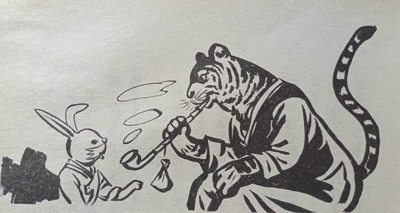 昔々、深い山奥に1匹のトラがいました。ウサギやノロ、アナグマやタヌキのような弱いけものを餌食にする老いぼれのトラで、煙草を吸うこともできました。