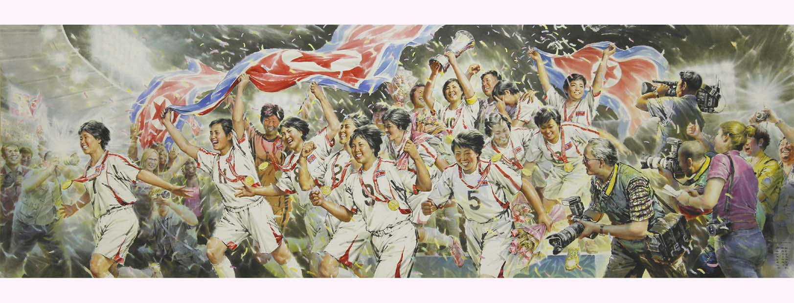 功労芸術家の称号を受けたパク・クァンリムさん他10人が手がけたこの作品は、国際競技で優勝した朝鮮の女子イレブンの頼もしい姿を造形芸術性豊かに描いたものである。