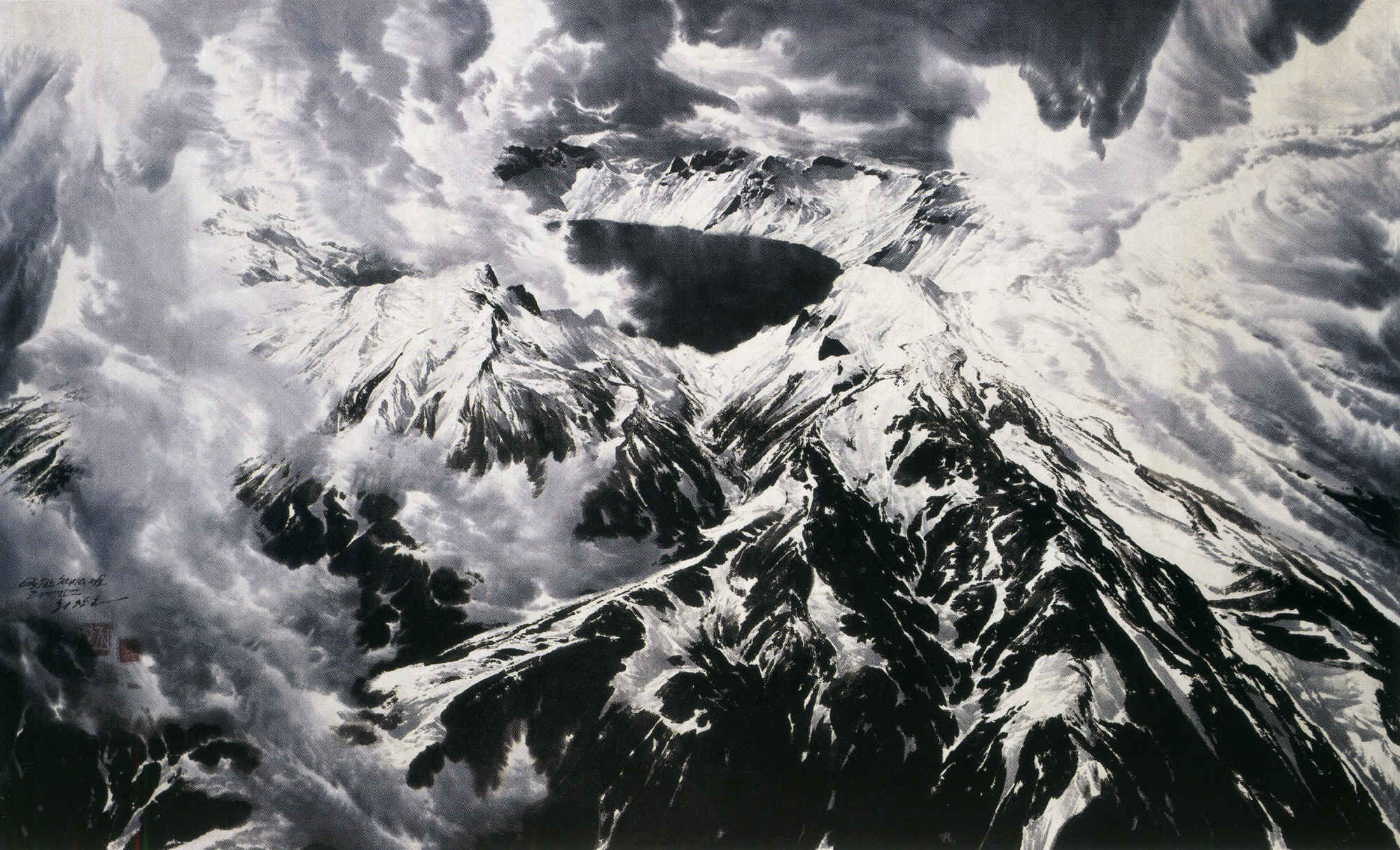 朝鮮画「ペクトゥ山の天池の冬」は、美術アトリエセンター・マンスデ創作社の朝鮮画創作団の人民芸術家の称号を受けたチェ・チャンホさんが、チュチェ96(2007)年に描いたものです。作品には、押し寄せる雲霞を散らし、勇壮な姿を表したペクトゥ山*1とカルデラ湖の天池*2が描かれています。