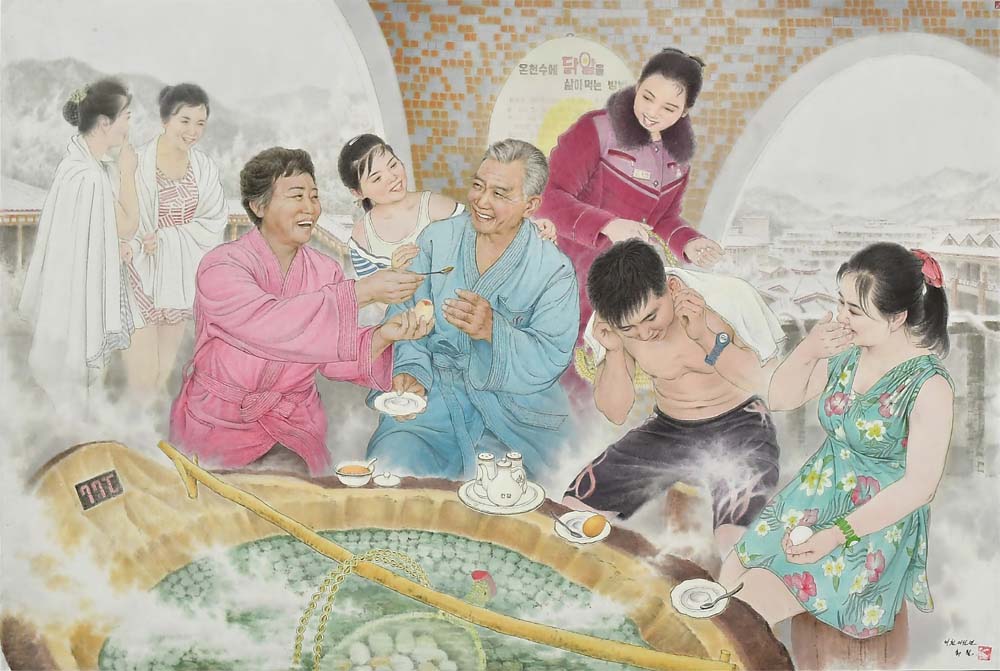 朝鮮画「幸せそうな笑い声」は雪に覆われた冬、人民の文化生活施設に立派に築かれたヤンドク温泉文化休養地で楽しい日々を送っている朝鮮人民の幸せそうな姿をビビッドに表している。