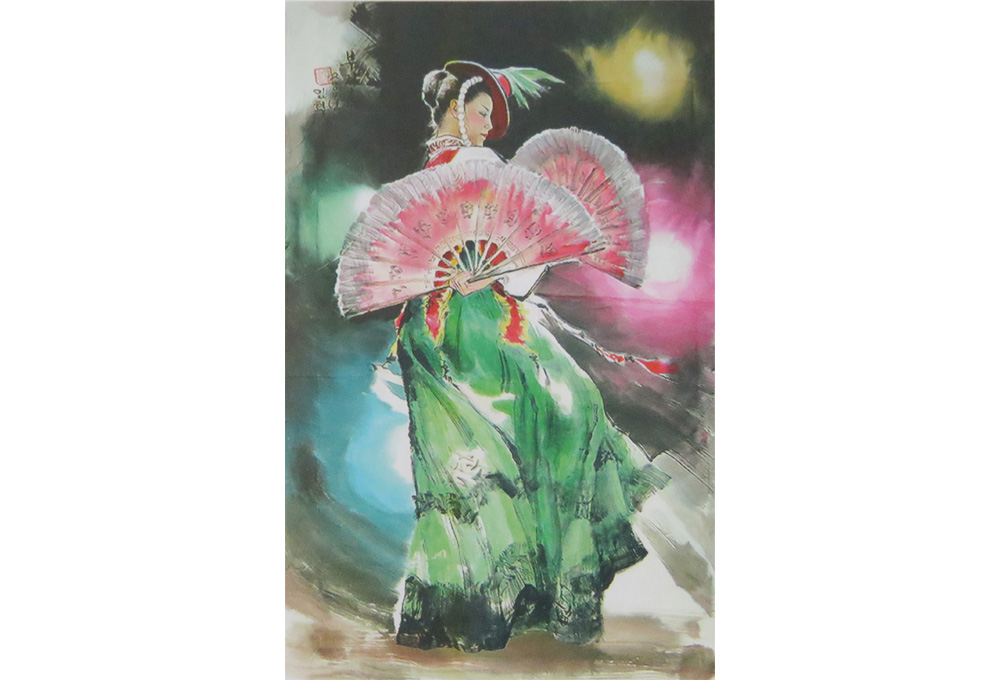 朝鮮画「扇の舞」はチュチェ96(2007)年にマンスデ創作社功労芸術家の称号を受けたイム・ヒョクさんが創作したものである。