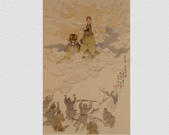 1930年代から創作されたこうした美術作品は朝鮮の美術発展の歴史に大きな意義があります。ご紹介する朝鮮画「金隊長の号令チャンベクの谷間に轟き渡る」もこの時、創作された代表作です。
