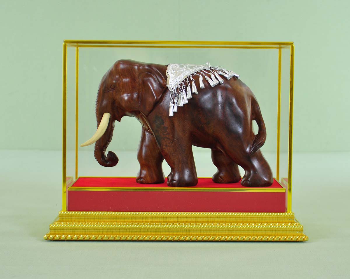 木彫りの象の背中に、精巧で繊細なつくりの艤装品があります。贈り物は有機ガラスのボックスに入れられ、ボックスの縁と支え台に金メッキが施されています。