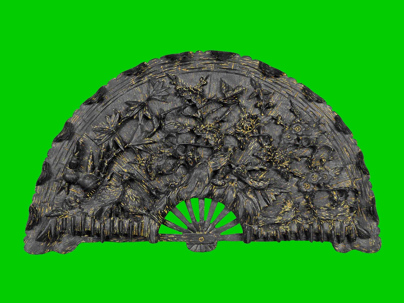沈香を精巧に加工した工芸品です。松の木と竹、花と鳥などがレリーフされています。ベトナムで珍しいものとなっている沈香は部屋に置くと香りを漂わせて、健康で爽やかな気分にさせるといいます。扇子にレリーフされている松の木は長寿を、竹は剛直さ、花は高潔さを象徴するといいます。