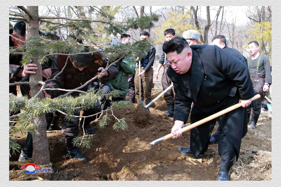 チュチェ104(2015)年3月、植樹デーに際して敬愛する最高指導者金正恩委員長は朝鮮人民軍航空及び対空軍のある部隊を訪れました。金正恩委員長は森林の造成と保護でも人民軍が先頭に立つべきだとし、直々用意してきた良種の木を植える場所も決め、戦闘機のパイロットたちと共に木を植えました。