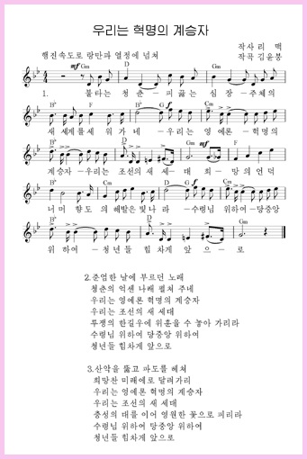 「歌『われら革命の継承者』は当時、朝鮮社会主義労働青年同盟第7回大会を迎える青年たちの高ぶった感情を表しています。歌詞は、チュチェの新しい世界を創造する朝鮮の青年たちの革命的情熱と誇り、党と指導者にあくまで忠実にしたがうたくましい気概と闘志を示しています。また、革命の1世、2世に見習い、いかなる困難も乗りきって希望に満ちた国の未来を早める青年の強い精神が込められています」