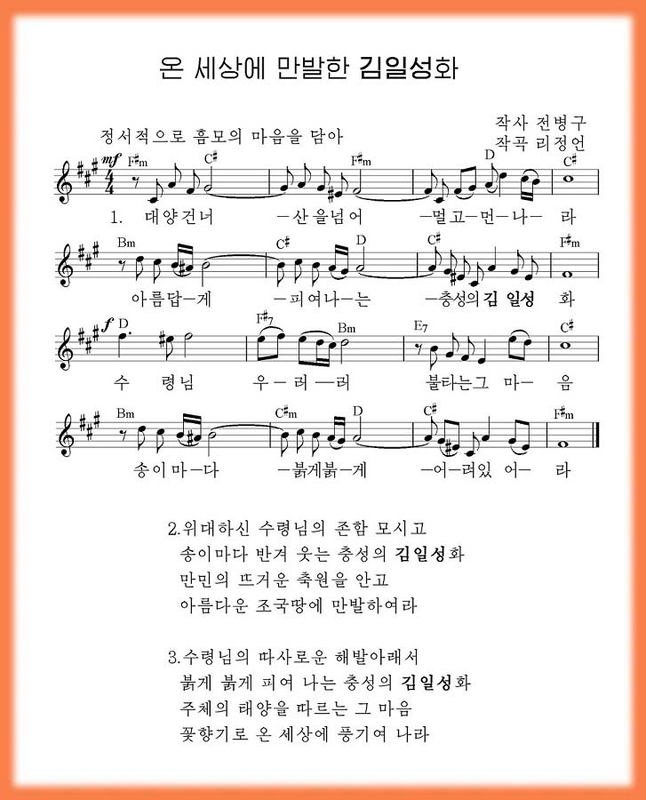 歌には金日成主席を永遠のチュチェの太陽と仰ぎ、慕う朝鮮人民と世界人民の一様な願いが込められています。主席を敬慕する世界人民の願いどおりに、不滅の花、金日成花が世界中に咲き誇ることを望んで止まない朝鮮人民の熱い思いがそのまま歌い上げられています。情緒溢れる柔らかなメロディーにより、歌詞の内容はいっそう強調されています。