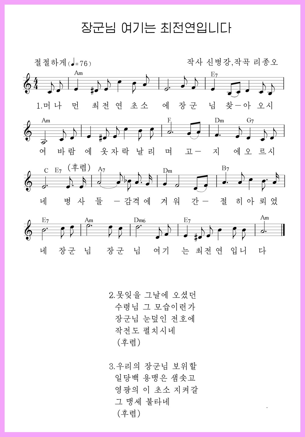 「『将軍ここは最前線です』、この歌が出たのは、共和国が帝国主義者の加増するばかりの押しつぶし策動と重なる自然災害により、厳しい試練を経ているときでした。そのとき、金正日総書記は国の運命と人民の幸せのために険しい九十九折の峰峰を越え、また越えて最前線の人民軍部隊を訪ねました。この歌はそのような総書記の不滅の業績を感動をそそる詩語でリアルに表しています」