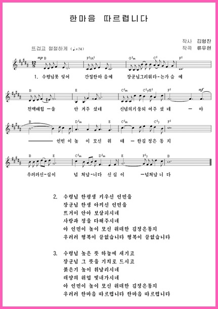 敬愛する最高指導者金正恩委員長への朝鮮人民の心からの敬慕と衷情の思いが込められた歌の中にはキム・ヒョンチャン*1作詞、功労芸術家リュ・ウヒョン*2作曲の「慕う思いはひとつ」、この歌もあります。チュチェ101(2012)年に創作されました。
