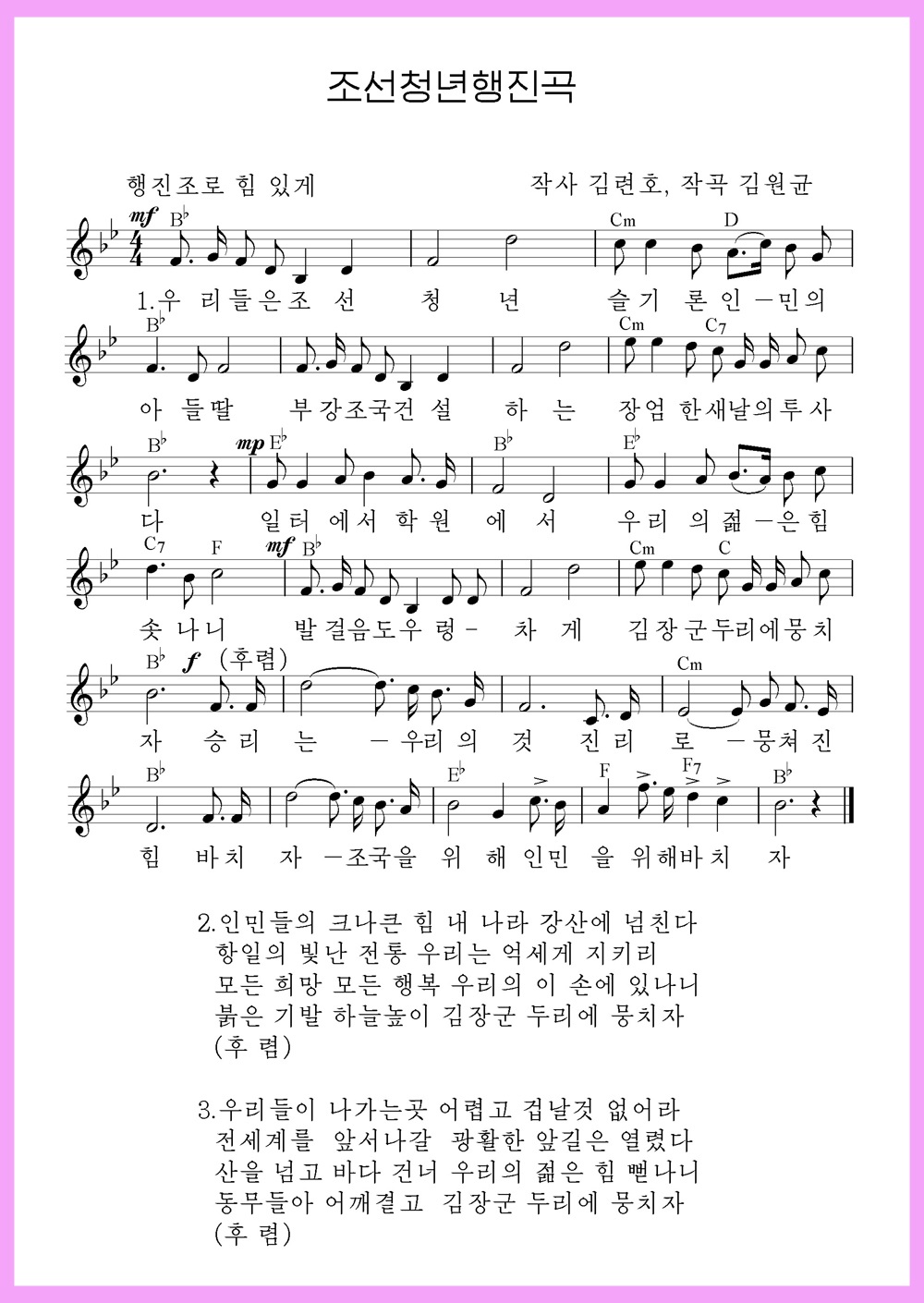 自力富強の旗を高く掲げて、チュチェの革命偉業の勝利の活路を開くため励んでいる朝鮮の青年が歌うこの歌はもっと高らかに響き渡るでしょう。