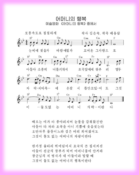 「母の楽しみ」、この歌は国のための道に息子や娘を立たせる朝鮮の母たちへの賛歌として広く歌われています。