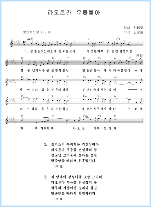 リフレーンは、血潮たぎる青春の情熱を栄える国づくりに捧げようとの朝鮮の青年の楽観に満ちた自負心を表わしています。明るく、迫力のあるメロディーは、歌の内容を一層浮き彫りにしています。