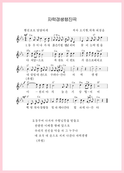 「自力更生行進曲」はチュチェ53(1964)年につくられました。当時は朝鮮人民が全ての部門、全てのところで一日に千里を天かけると言う伝説の馬チョンリマ*1を駆る勢いで疾風のごとく前進したチョンリマ大高揚の時でした。オ・ギヒョン作詞、チェ・ギョンユン作曲のこの歌にはこうした時代の精神がそのまま込められています。
