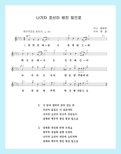 「進もう朝鮮、併進前へ」はチュチェ102(2013)年、金日成賞受賞者のユン・ドゥグン作詞、人民芸術家称号の受賞者チョン・グォン作曲の歌です。経済建設と核武力建設を併進させる朝鮮労働党の戦略的路線に則り、必勝の信念を持って力強く進む朝鮮人民を歌い上げています。