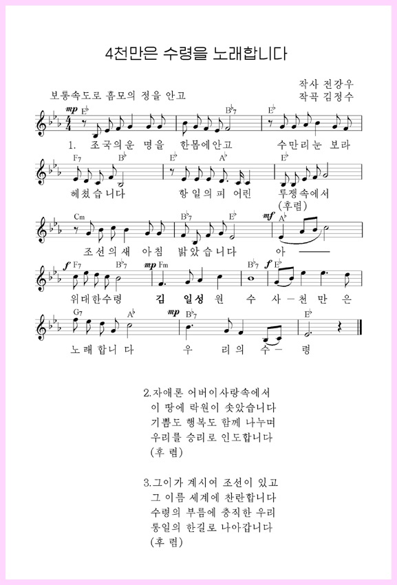 歌には、抗日革命の血戦万里を掻き分けて国の解放を成し遂げ、社会主義の楽土を建てて、朝鮮を輝かせた金日成主席を仰ぎ慕う朝鮮人民の熱い思いが込められています。また、主席が指し示す一路へとまっしぐらに進む朝鮮人民の信念が込められています。