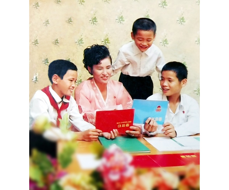 5人の息子を育てる日々、キムさんには嬉しい時も多くありました。チュチェ101(2012)年の1年だけを見ましても、4月には敬愛する最高指導者金正恩委員長が国事で多忙な中にもキムさんの息子たちが差し上げた作文集を見てあげました。そして、6月には3番目の息子が朝鮮少年団創立66周年記念行事に参加して金正恩委員長と共に記念写真を撮りました。また、11月にはキムさんが第4回全国母親大会に参加して、金正恩委員長と共に記念写真を撮りました。