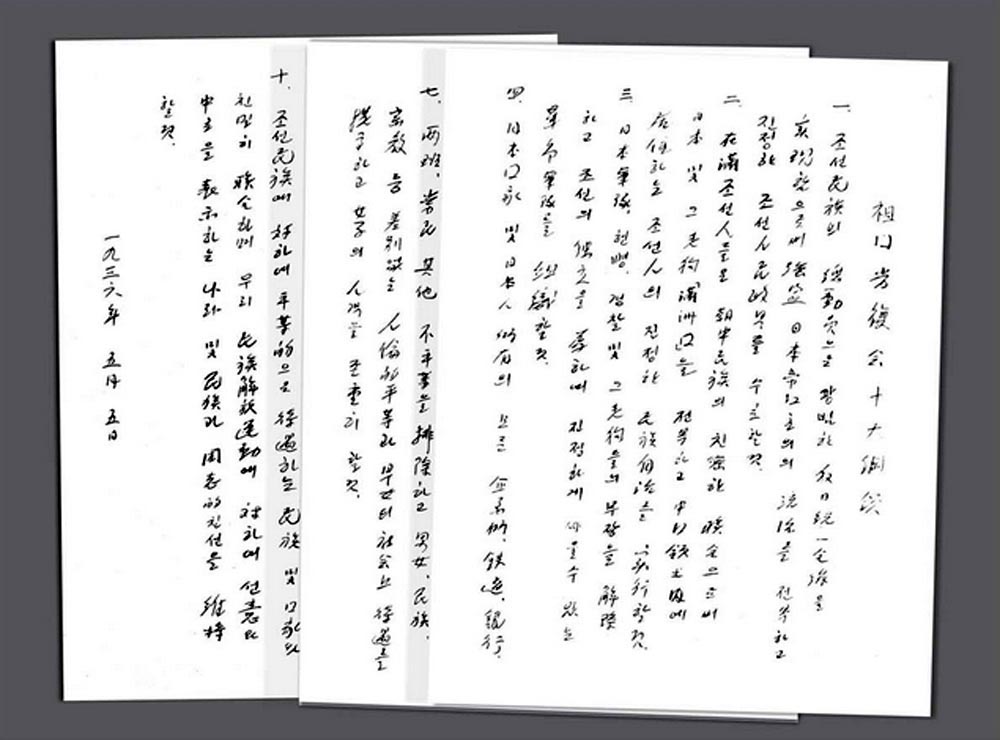 祖国光復会の創立により、すべての反日勢力を国の解放のための戦いに力強く呼び起こすことができました。祖国光復会の組織は国内各地はもとより、朝鮮人が住んでいる国外の多くの地域にも拡大し、労働者、農民、青年学生、知識人を初め広範な反日愛国勢力がこれに加わりました。主席の指導の下に、祖国光復会の組織は日帝との最後の決戦に民族のみなを同時に立ち上がらせる強力な勢力として準備されました。