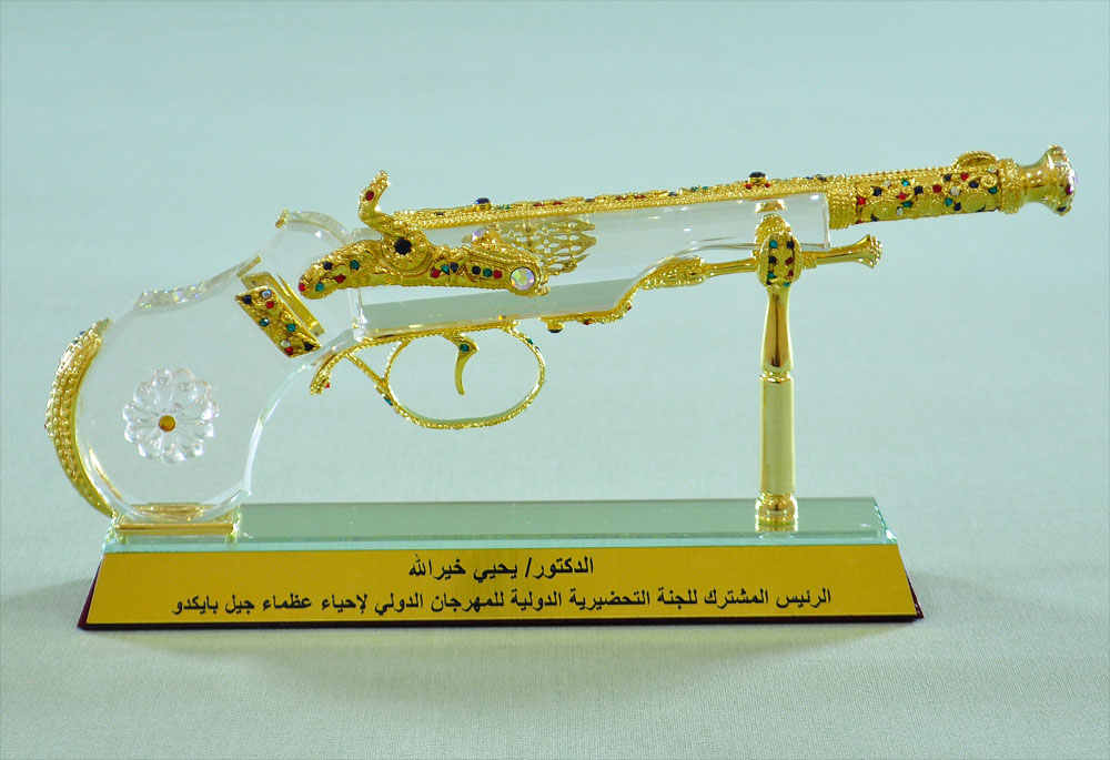 贈り物は、数世紀前にエジプトで使われたピストルの形を真似て水晶で作ったものです。銃身と掃除棒、安全装置、遊底などは金メッキを施した金属で作ったものです。金属の部分は華やかな色の宝石で飾りました。