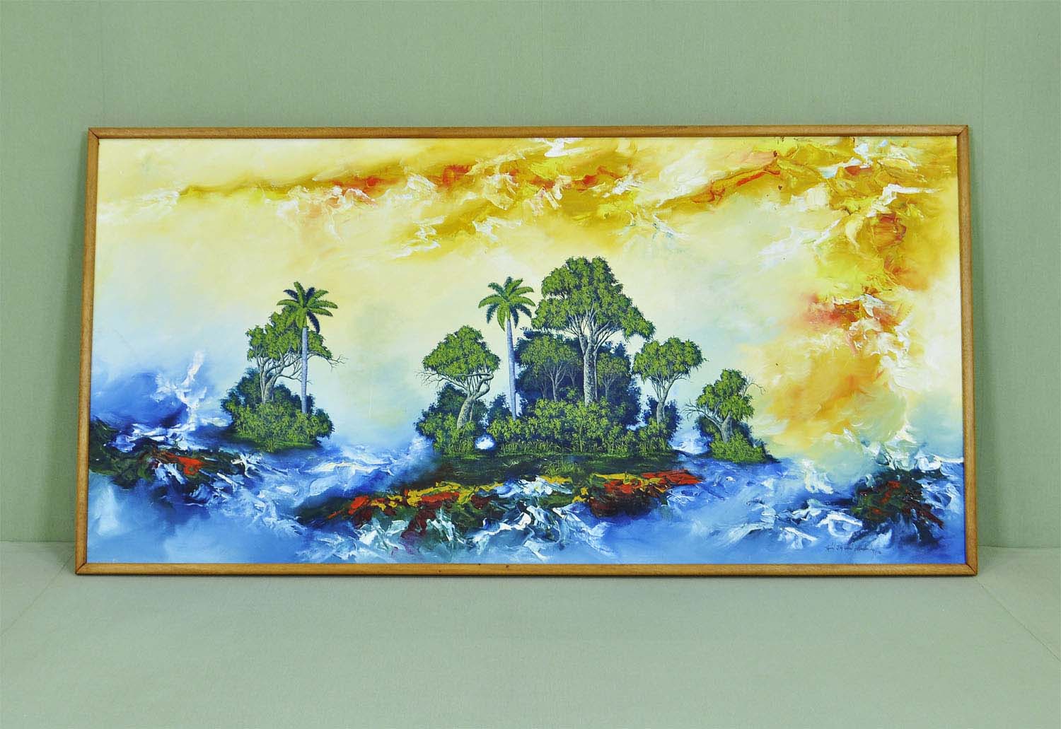 海の真ん中にある島と、そこに育つキューバの国樹であるヤシの木などの植物、赤く染まる空に浮かんでいる雲、荒れる海が描かれています。荒れる海は、キューバの人の強靭さを表していると言います。