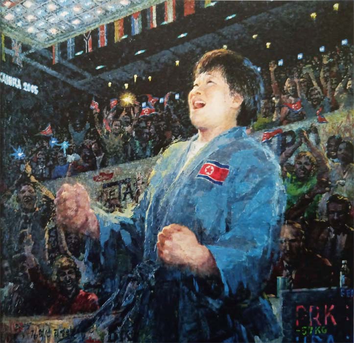 油絵「勝利」は、金日成賞、労働英雄称号の受賞者で人民スポーツマンのケ・スンヒ選手が、2005年世界柔道選手権女子57キロ級の決勝戦で相手を下した瞬間のガッツポーズを描いている。この競技でケ選手は、世界選手権の3連覇を果たした。