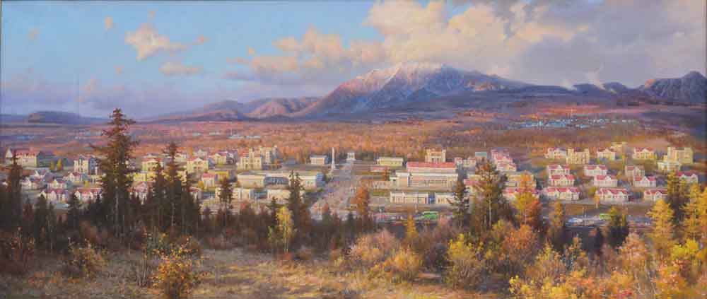 油絵の特性を生かして、夕焼けに赤く染まったチュンフン里の美しい風景をリアルに表した油絵「夕方のチュンフン里」は、マンスデ創作社のアーチストであるリ・チュンソプさんとカン・ミエさんが共同で創作したものです。