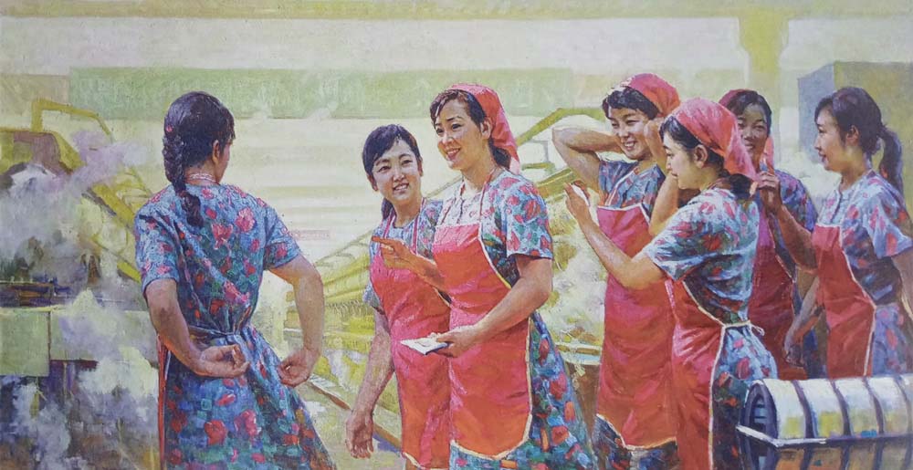 作品は、より多くの糸を生産する一念で作業場に向かう女性労働者の明るい姿を描いています。