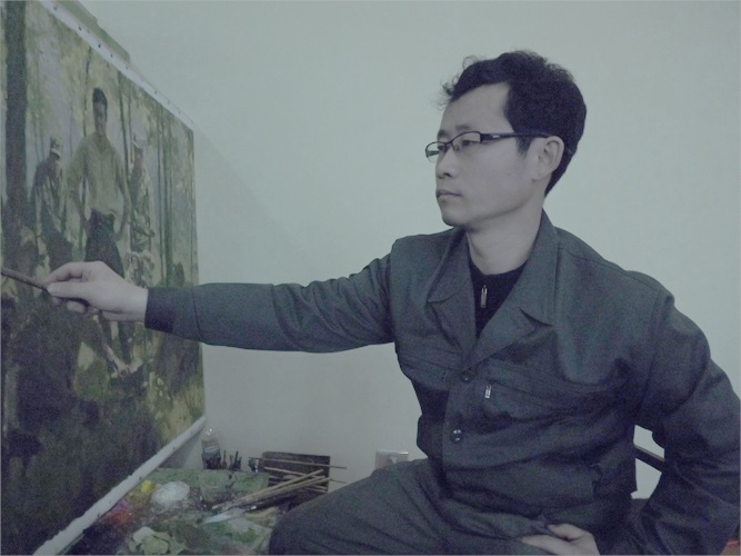 「作品を見ますと、手前に配置した偵察兵たちの姿は比較的暗い感じです。つまり、偵察兵たちが越えてきた死線や戦闘任務遂行の多難さ、そして壮烈な最期を遂げた戦友の復讐を誓うその姿がはっきりと現れています。一方、中ほどと遠くに配置された進撃する人民軍勇士たちの姿、そして共和国の旗がなびく戦車、野や山、川、空の地色は比較的明るくしています。こうすることにより、侵略者があがきの限りを尽くしても必ず勝つということを強調しています」