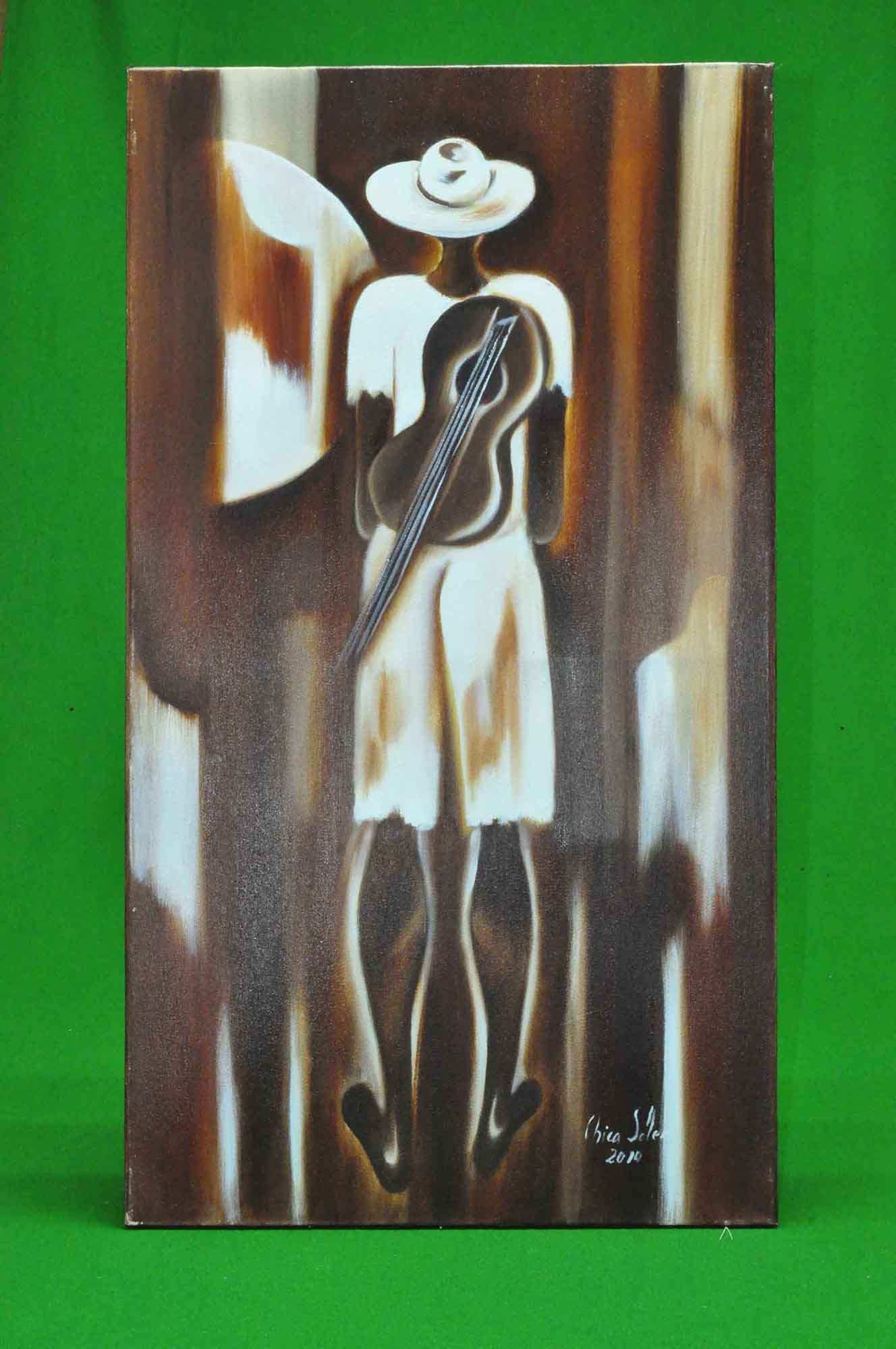作品は、ギターを担いで太陽に向かって歩く音楽家の姿を描いたものです。