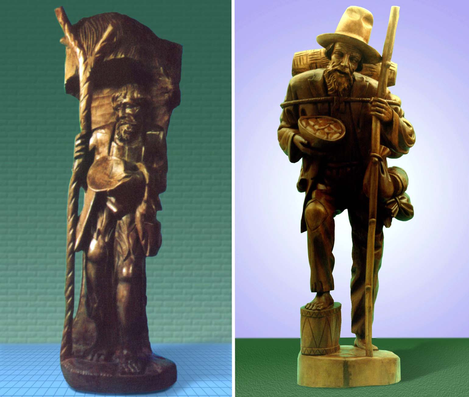 朝鮮の名山のミョヒャン山*1に位置している国際親善展覧館には、対照的な二つの木の彫刻があります。空っぽの鉢を手にして寂しく泣いている農民と、穀物いっぱいの鉢を手にして幸せそうに笑っている農民、この二つの工芸品はエクアドルの「ボルンタッド」出版社のウンベルト・オルチス・フロレス元社長から贈られたものです。