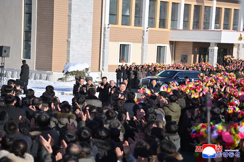 金正恩総書記が竣工式場に到着すると、社会主義文明興隆の新しい転機を連綿と開いていく全国大家庭の親しい慈父を仰いで表する最大の敬意の念が熱狂的な歓呼の声となって噴出した。
