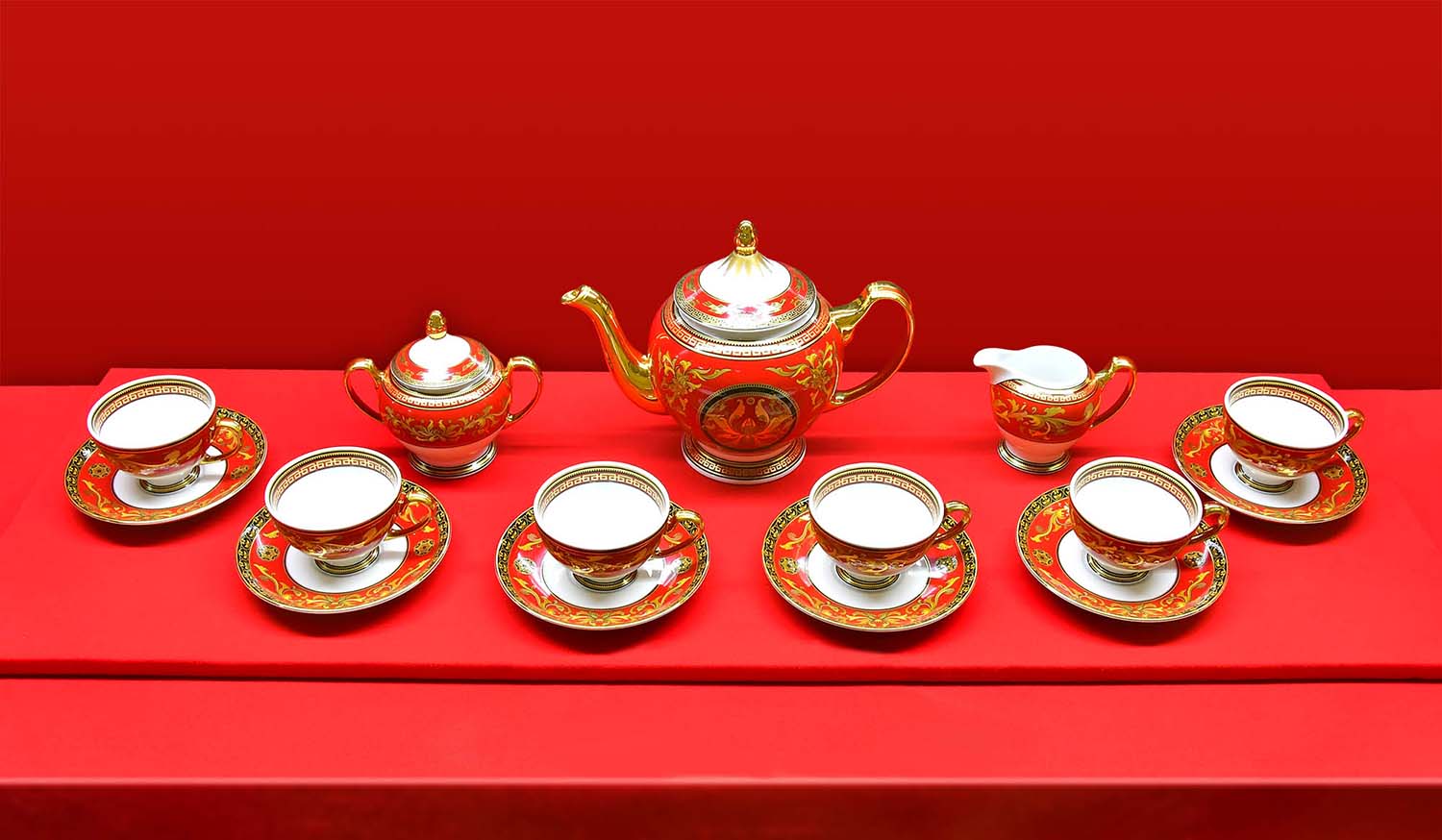 贈り物は、高級な焼き物を専門に制作する会社で作ったもので、水差し1個とミルク差し1個、砂糖入れ1個、茶碗と茶碗受け皿それぞれ6個からなっています。