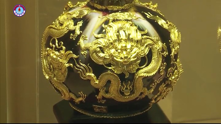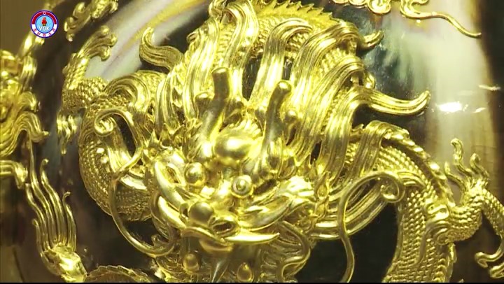 5匹の竜を浮き彫りにしたものです。竜は尊く神聖なものを、5という数字は五福を意味するとの事です。この工芸品には中国の3大伝統工芸技術である、福州の漆工芸技術と景徳鎮の焼き物製作技術、北京の景泰藍の焼き物製作技術が導入されました。
