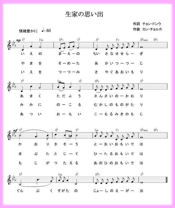 チョン・ドンウ*1作詞、功労俳優カン・チョルホ*2作曲の歌「生家の思い出」は、チュチェ81(1992)年作の歌で、美しい思い出と共に募るばかりの女史への朝鮮人民の恋しさをあらわしています。