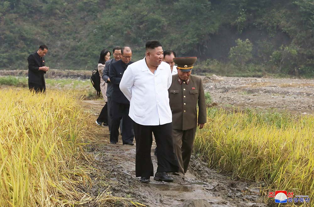チュチェ109(2020)年10月初め、敬愛する金正恩総書記はキムファ郡*1の被害復旧の建設現場を訪れました。その時、路上で総書記は被害が出た各地の作柄を把握しました。