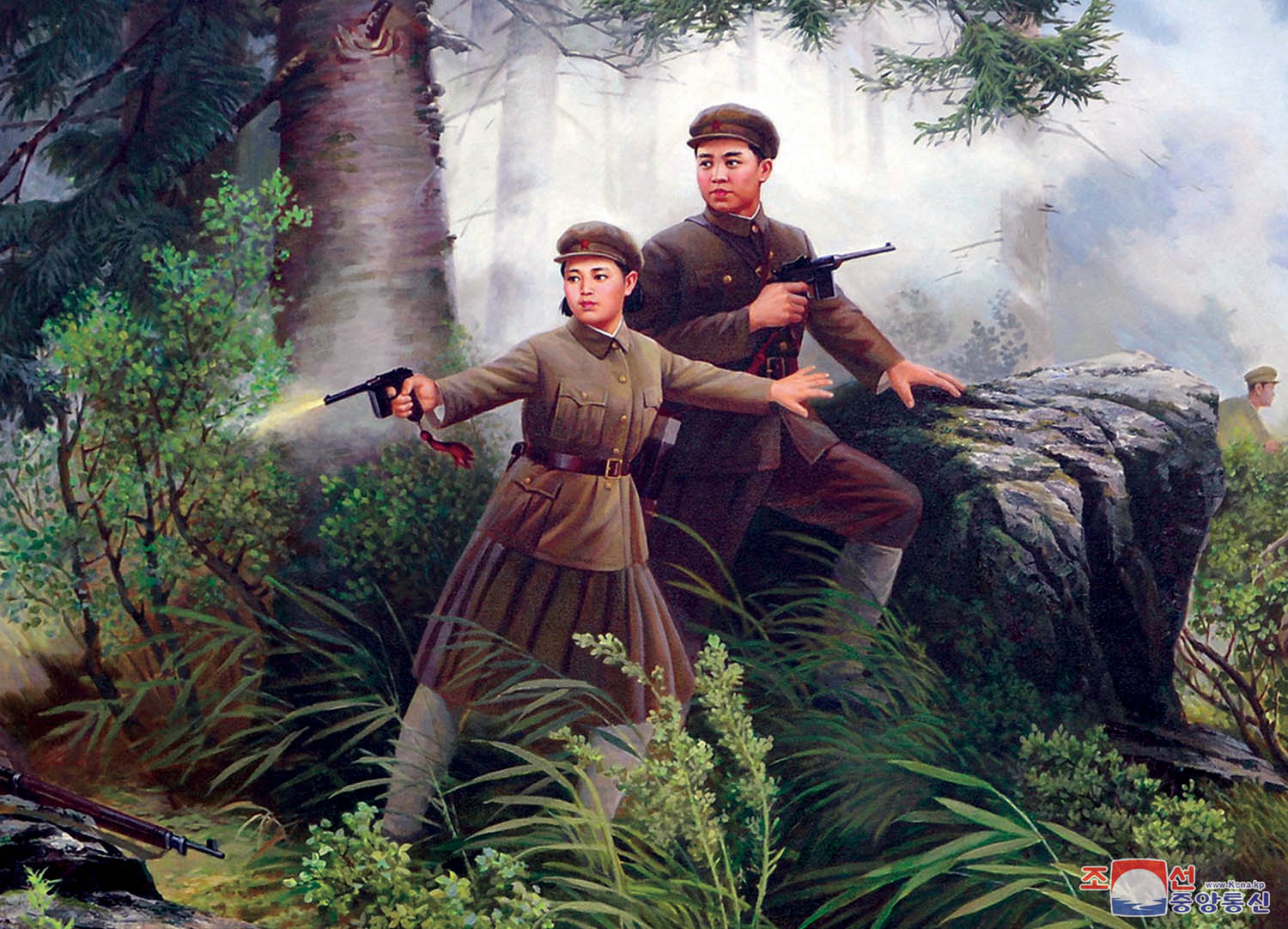 主席の身の安全のために周辺を鋭く監視していた金正淑女史は、葦の茂みに身を隠して山腹めがけて銃口を向けている5、6人の敵兵を発見しました。瞬間、女史はすばやく身をかわして主席を守る盾となり、敵兵を打ち倒しました。
