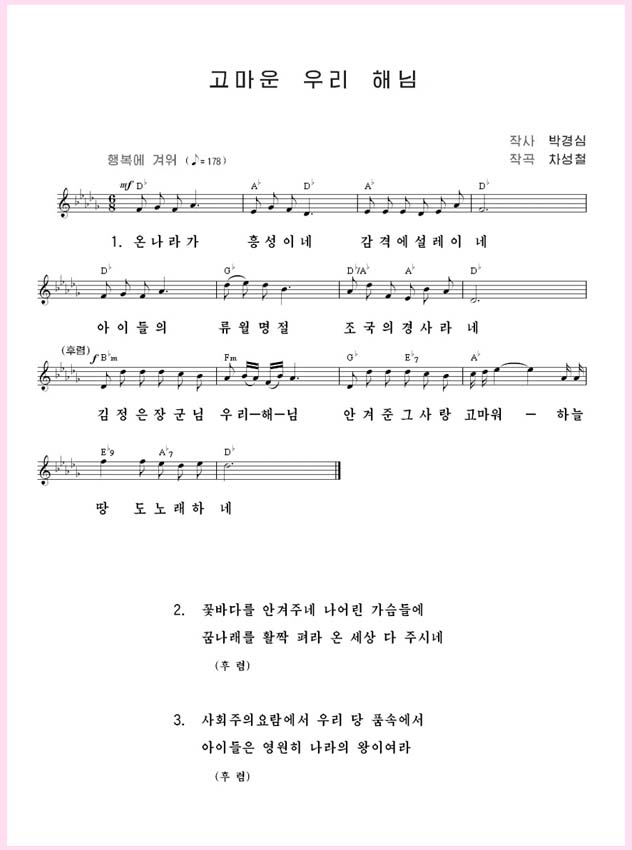 次の世代を大事にする敬愛する金正恩元帥の許で何羨むものなく育つ朝鮮の子供たちの幸せを歌っています。子供たちは国の王様、未来の主人公だといって、子供たちのためなら何も惜しまない金正恩元帥の下で育つ朝鮮の子供たちの誇りと幸せ、感謝の情がそのまま表れています。メロディーは、童心に合うよう明るく朗らかなワルツ調です。