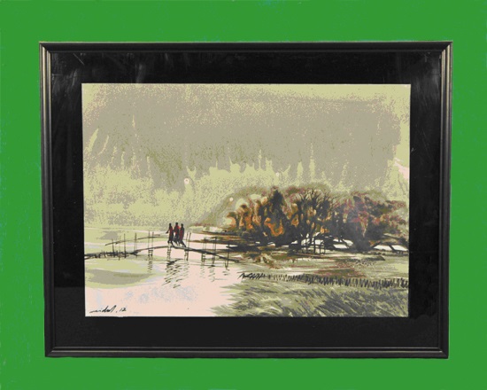 バングラデシュ朝鮮友好・連帯委員会はチュチェの革命偉業、先軍革命偉業をそのまま引き継いでいる金正恩元帥への心からの敬慕の念を抱いてバングラデシュの有名な画家にこの贈物を注文しました。バングラデシュの農村風景を描いたもので、熱い祖国愛の感情が込められた作品だと言います。