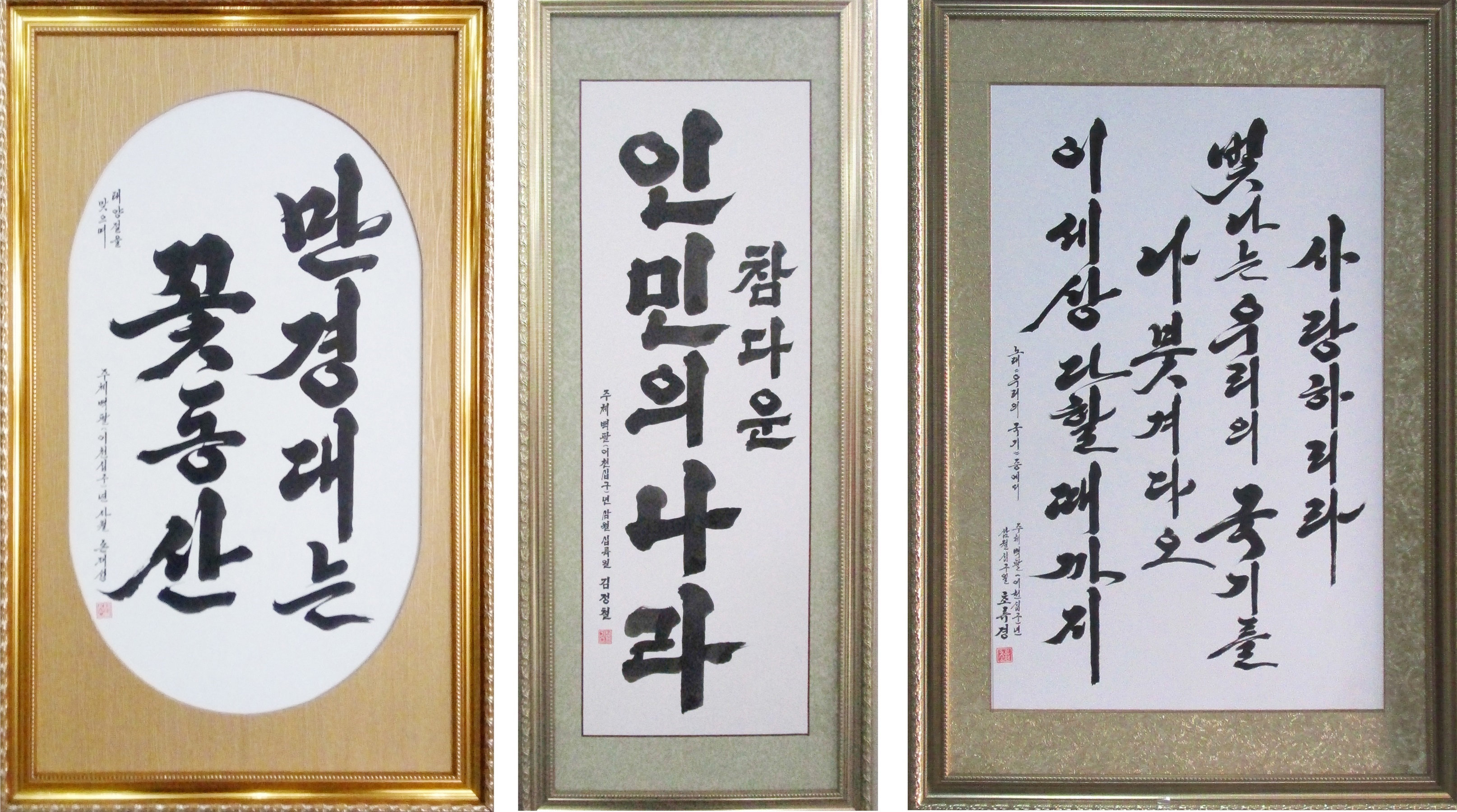 国レベルの書道展とデッサン展で評価の高い鉛筆画「生物時間」、「けなげな心」、「母の日に」、書道「マンギョンデは花園」、「真の人民の国」、そして「テーブル時計のデザイン」、「鏡のデザイン」を始め、数多くの作品はユンさんの教え子たちが創作したものです。
