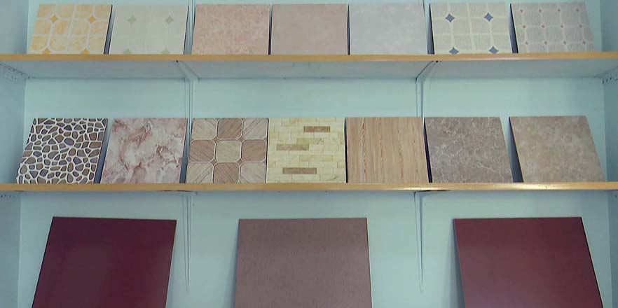 樹脂サッシ職場では生産過程に出る副産物で仕上げ建材の格子縞の天井材料を製作するなど各サイズの樹脂サッシを作っています。タイルや衛生陶器、樹脂サッシ、塗装材などのサンプルを見ても、その種類や形の多様性がよくわかります。
