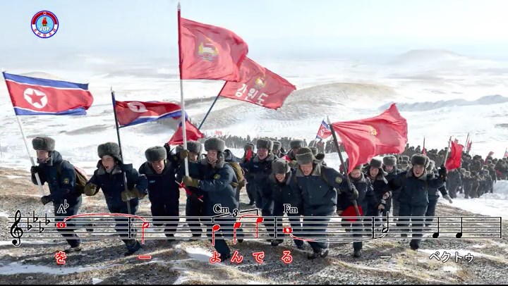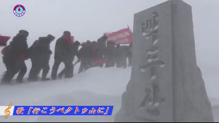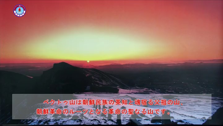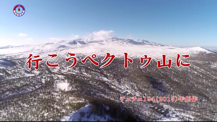 (字幕)ペクトゥ山は朝鮮民族の英知と魂宿る父祖の山、朝鮮革命のルーツとなる革命の聖なる山です。歌は、太陽の聖なる山ペクトゥ山を胸に、一生をペクトゥの精神、気概で生きていく朝鮮人民のゆるぎない意思を表しています。