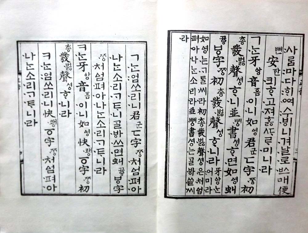 訓民正音は発達した類型である字母式の文字で、自分の独特の創製原理を持っています。この文字を創製した人たちは舌や唇、喉のような発音器官が音を出す時の変化を真似て、基礎となる文字を作りました。そしてその文字に基づいて音声学的に同一な派生文字を作る方法で他の全ての文字も体系付けました。