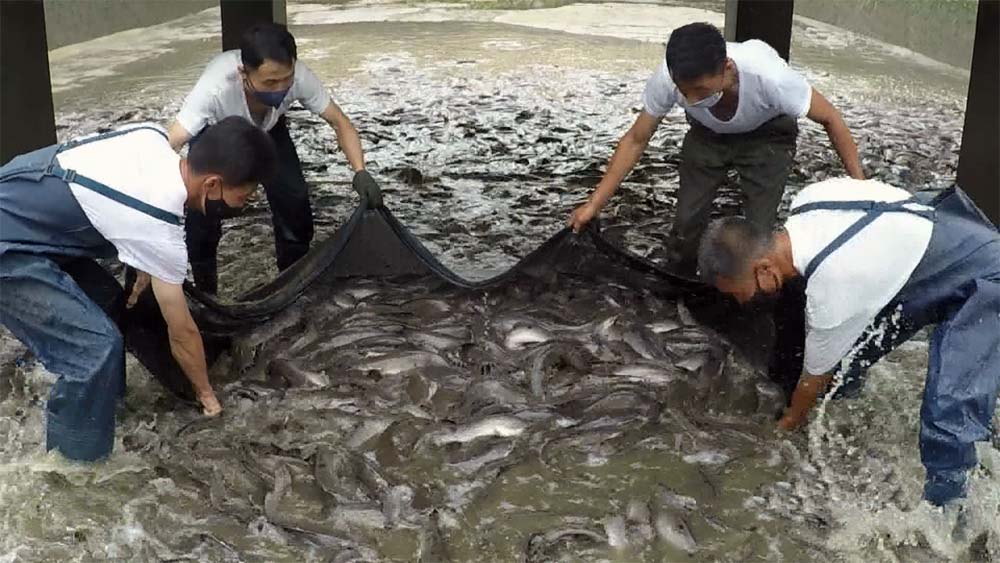 構内にある10の養殖池では、毎年、10トンあまりの魚を生産していますが、昨年は20トンの鯰を生産したとのことです。工場の各所に、様々な養殖池が整えられています。工場では、稚魚を段階別に育てるための2階建ての種苗場をつくり、ここで育てた魚を各職場に配っています。また屋外では2回、屋内では3回の養殖ができるようになっていますが、屋内の養殖池では今、鯰を捕った後、2回目の養殖に入りました。