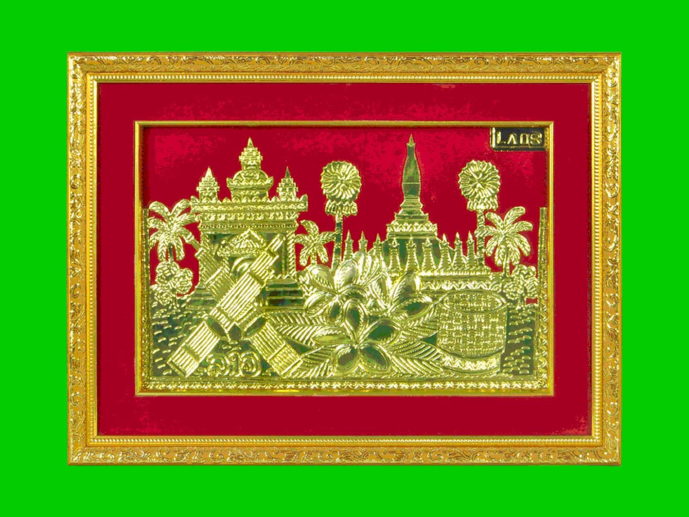 贈り物には、タッ・ルアンとシエントン寺院をはじめラオスの文化の代表的なシンボルがデザインされています。工芸品の右の上段には、英語で「ラオス」という字を書いた金属板が付いています。