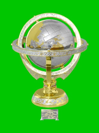 緯度と経度を表したリングの左右の側面には、平和のシンボルである月桂樹がレリーフされています。またそのリングと地球儀の中心の軸の部分には軸の中心の不変さを強調して、7つのオーストリアの水晶を嵌めこみました。地球儀を持ち上げている基壇の首の部分には、四季を通していつも金正恩委員長の無事を願う意味から、朝鮮の24節季を象徴する24のルビーで飾りました。