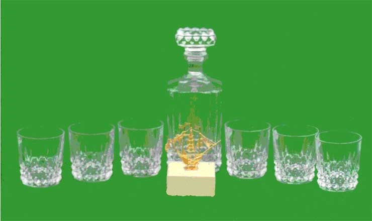 金細工「帆船」は、長さ10センチ、高さ9センチです。クリスタルのボトルとグラスの下の部分には、異彩を放つ装飾が施されています。ボトルは口の直径が4センチ、高さは25センチです。グラスは形とサイズが同じで、口の直径は8.2センチ、高さは9センチです。