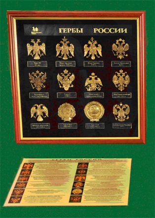 横と縦ともに35センチメートル、厚さ3.4センチメートルの正方形の額縁の中に、12点のロシア国章があります。ロシアの「ミクリャイフ鋳物」会社で製作したもので、各時代、各時期のロシア国章がデザインされています。