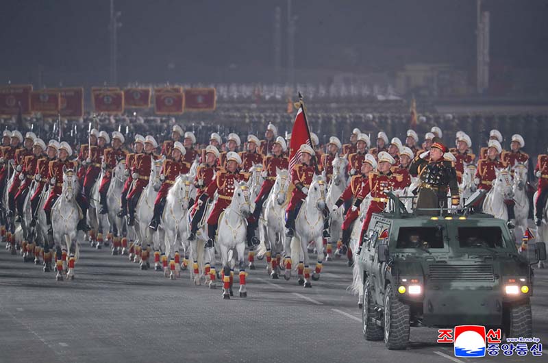 党大会の決定を貫徹するための忠誠の進軍路を赫々たる軍功と貴い偉勲で輝かす人民軍将兵の鉄の意志を抱いて名誉騎兵縦隊が閲兵行進の先頭に立って前進した。